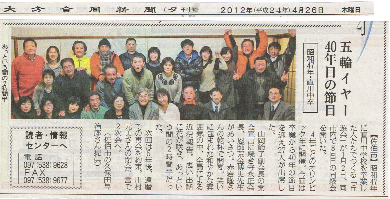 同窓会の写真が大分合同ツーウエイに掲載! 2012年4月26日 最終更新日時 : 2023年12月14日 kyuyuad 1月2日開催しました丘遊会同窓会の写真が4月26日に大分合同新聞の夕刊、ツーウエイの欄に掲載されました。ぜひご覧ください。