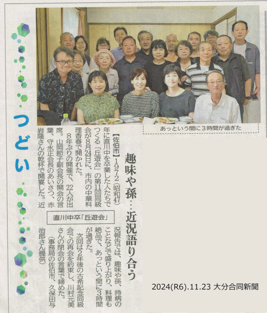 同級会の様子が大分合同新聞「つどい」に掲載されました! 2024年11月23日 最終更新日時 : 2024年11月23日 kyuyuad 8月24日に開催された同級会の様子が、本日23日(土)の大分合同新聞「つどい」コーナーに、掲載されました!あの日の楽しいひとときの様子が、記事になっています。ぜひご一読ください。 LEAD Technologies Inc. V1.01