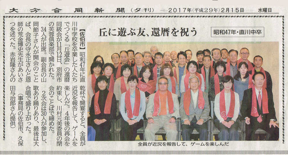 還暦同窓会が大分合同ツーウエイに掲載! 2017年2月23日 最終更新日時 : 2023年12月13日 kyuyuad 平成28年11月12日開催しました丘遊会還暦同窓会の様子が2月15日に大分合同新聞の夕刊、ツーウエイの欄に掲載されました。ぜひご覧ください。合同ツーウエイ